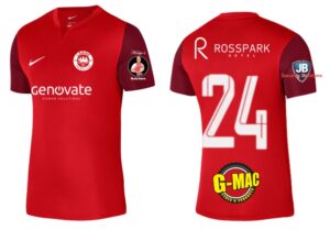 The match shirts are proudly sponsored by Genovate Power Solutions (front of shirt), Rosspark Hotel (back of shirt), G-Mac Tyres (back of shirt), Hodge’s Butchers (sleeve) and JB Security Solutions (shirt sleeve). Jeff and his Testimonial Committee would like to extend their gratitude to each business for their support ahead of the game.